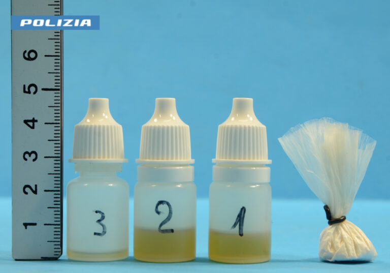 Nel pomeriggio di venerdì, gli investigatori della 4^ sezione antidroga hanno eseguito una perquisizione a casa sua. Durante l’operazione, sono stati rinvenuti tre piccoli flaconi in plastica contenenti una sostanza liquida di colore giallo, nascosti all’interno del frigorifero della cucina. Le boccette, senza etichetta identificativa, erano nascoste tra gli alimenti in modo da non essere facilmente individuate.