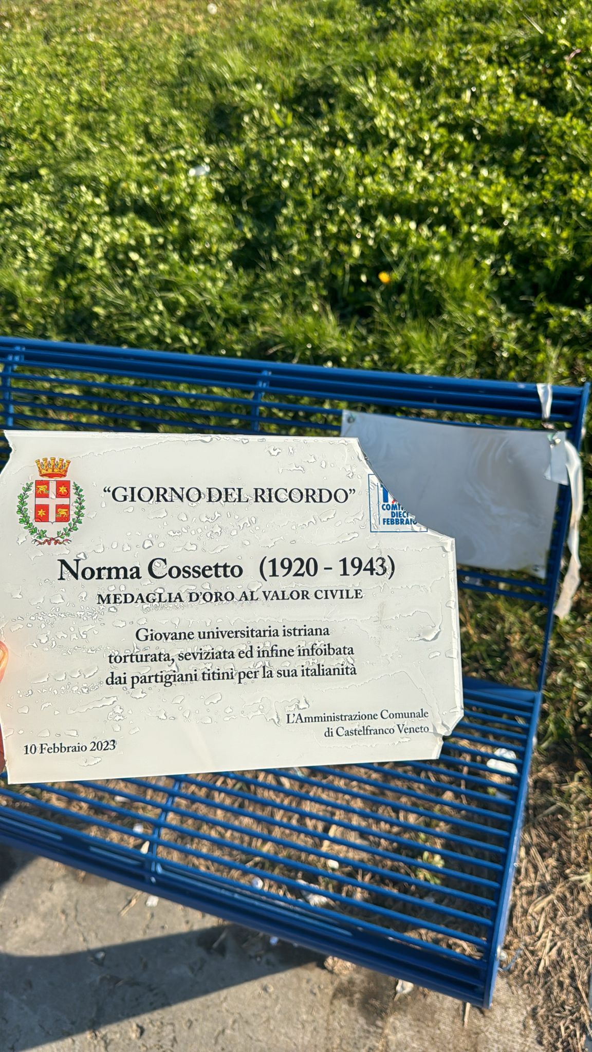 La targa commemorativa a Norma Cossetto a Castelfranco Veneto (provincia di Treviso) è stata danneggiata e rimossa