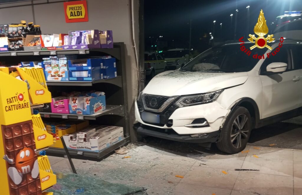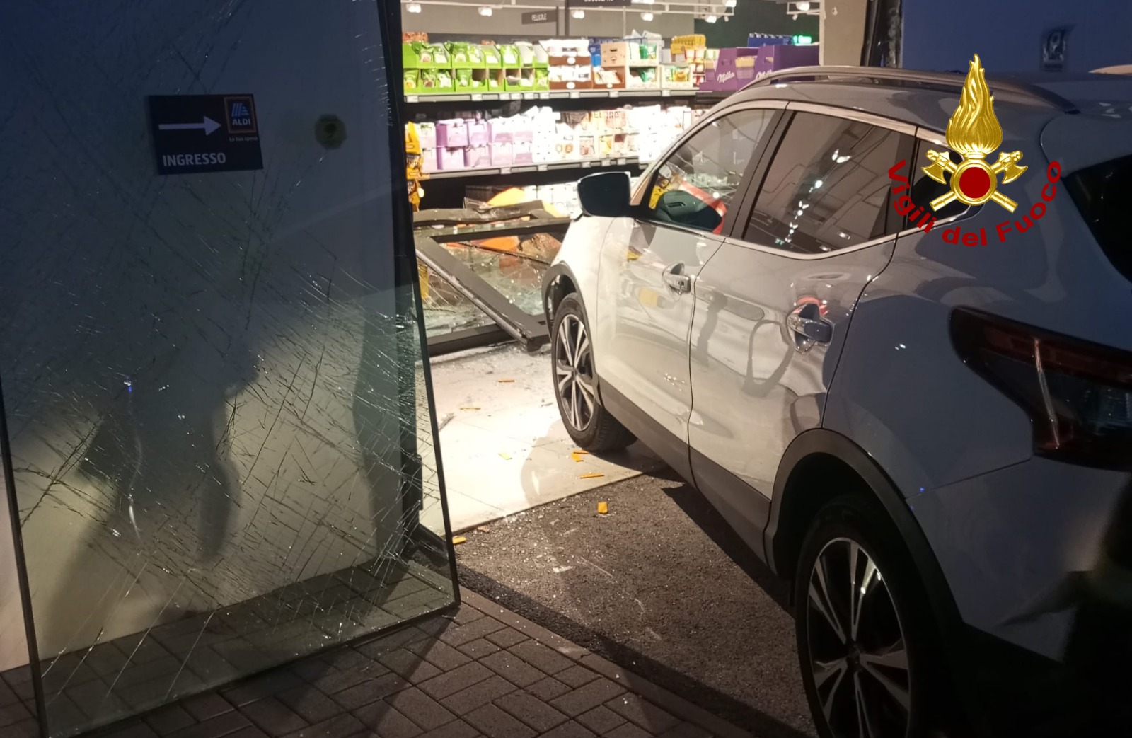 Alle 16:30 i vigili del fuoco sono intervenuti in Via Vittorio Veneto a Thiene per un’auto che ha sfondato la vetrata del supermercato Aldì finendo all’interno dell’edificio.