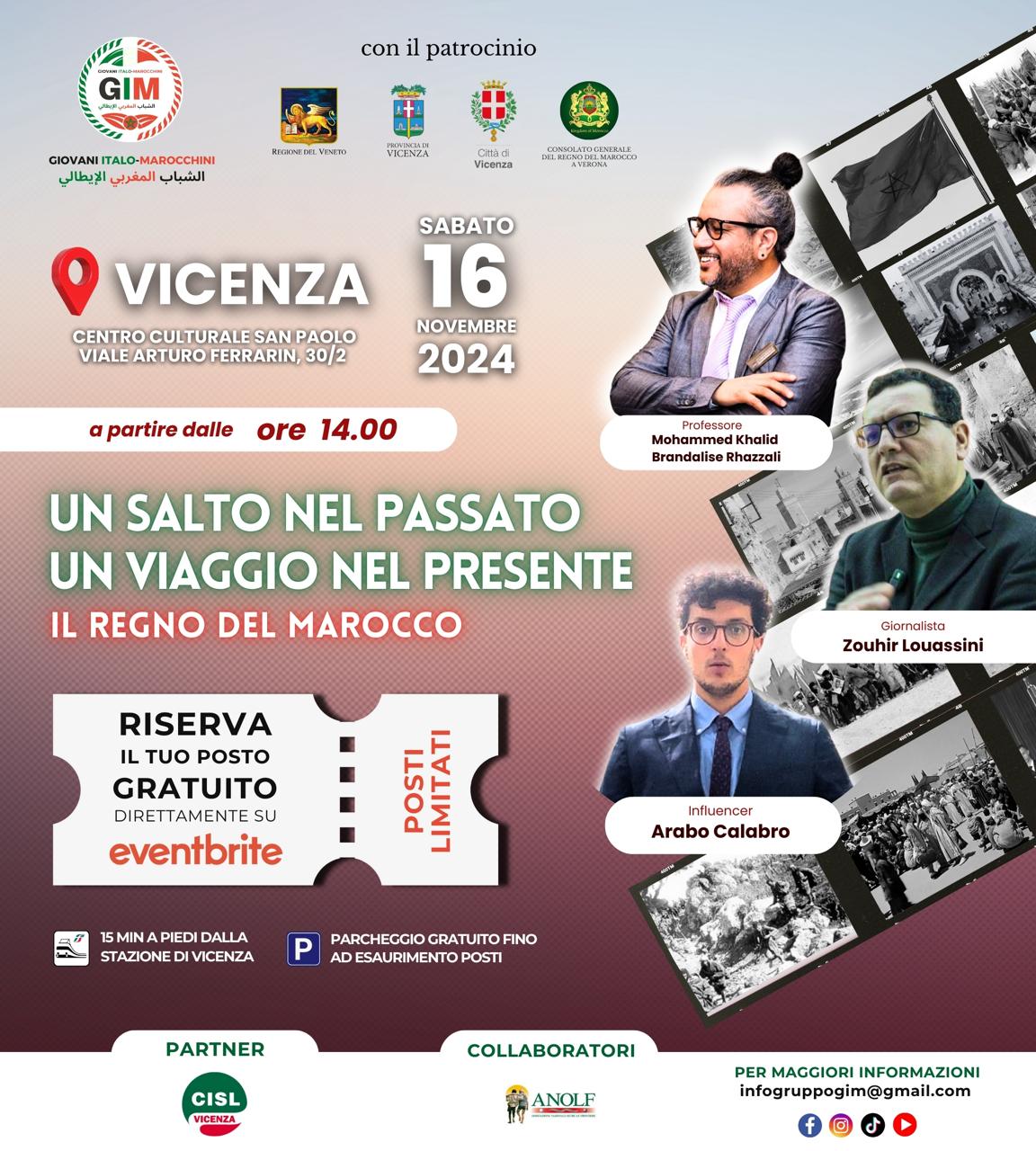 Appuntamento sabato 16 novembre, a partire dalle 14, al centro San Paolo di viale Arturo Ferrarin a Vicenza, con “Un salto nel passato, viaggio nel presente. Il Regno del Marocco”: evento culturale organizzato dall’associazione Gim – Giovani italo marocchini Aps.