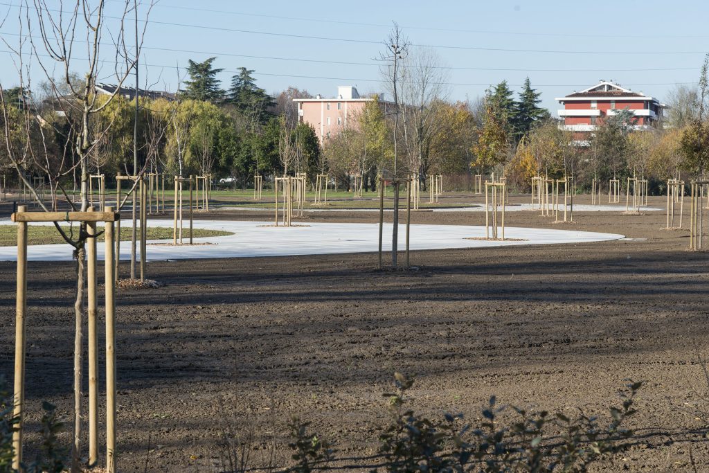 Il disegno complessivo del parco parte dallo studio dell’area e dalle sue caratteristiche attuali: la valorizzazione del bosco in via di rinaturalizzazione che si è sviluppato negli anni e il mantenimento del disegno agricolo esistente fatto di fossi e piccoli avvallamenti che hanno la funzione di proteggere l’area dalle piogge, favorendo l’assorbimento dell’acqua in eccesso.