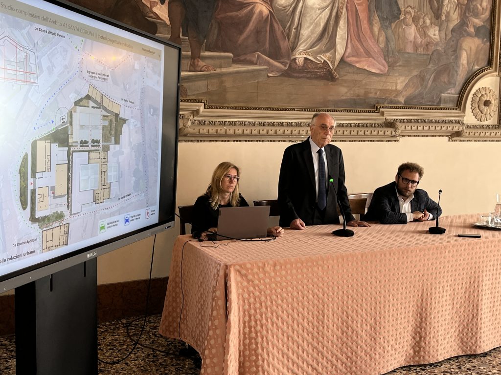 Lo studio è accompagnato da un approfondimento sull’inserimento del grande albergo nell’ambito urbanistico costituito dal complesso dei chiostri e dal parcheggio di Santa Corona, in modo da garantire che la collocazione del nuovo edificio sia coerente con eventuali future riqualificazioni di tutta l’area.