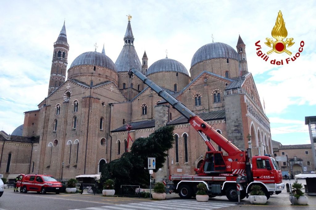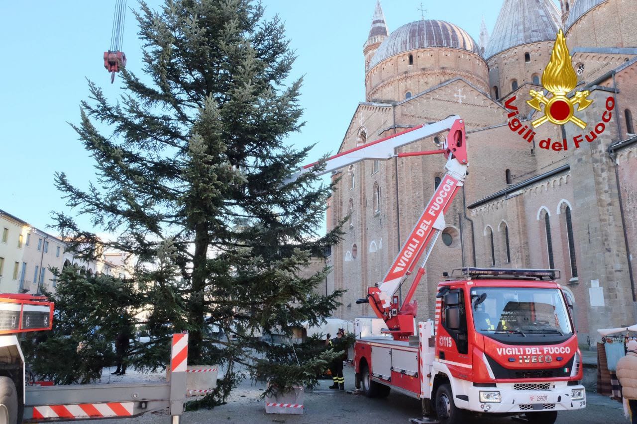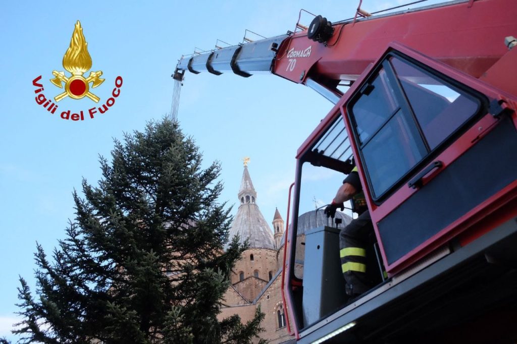 Stamattina i vigili del fuoco sono intervenuti in piazza del Santo a Padova per innalzare un maestoso abete bianco di 13 metri, donato dalla comunità del Primiero al Comune.