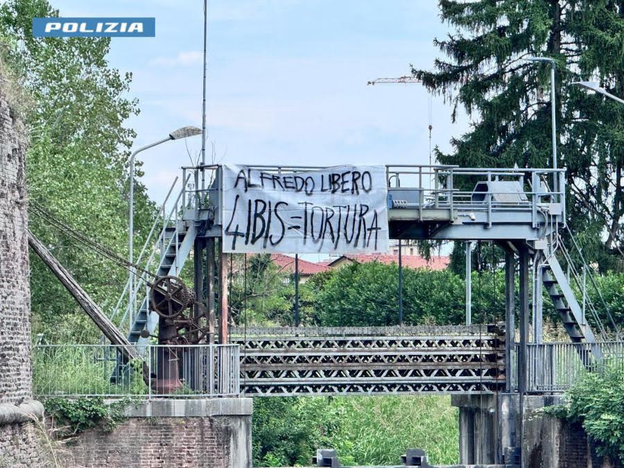 Gli agenti della questura di Padova hanno individuato un altro striscione di grosse dimensioni. Affisso sul ponte di un canale nell’area verde di via Ormaneto, lo striscione porta la scritta scritta: “ALFREDO LIBERO 41BIS = TORTURA”. Il chiaro riferimento è alla vicenda del noto anarchico Alfredo Cospito.