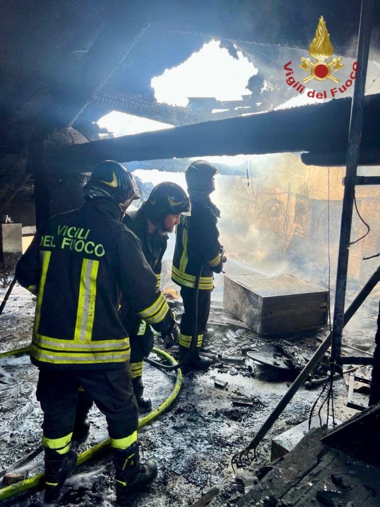 Sul posto i carabinieri. Accertamenti in corso da parte dei tecnici dei Vigili del fuoco per indagare sulle cause del rogo.