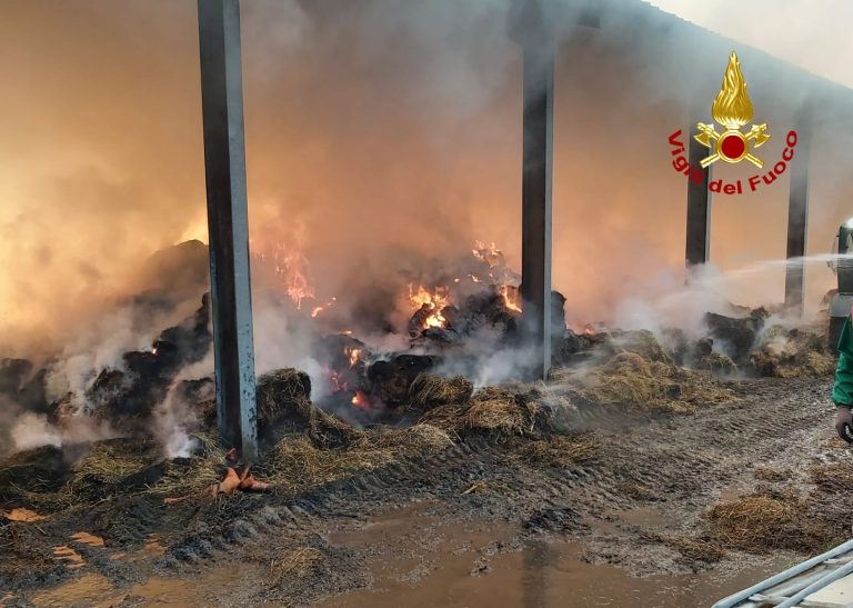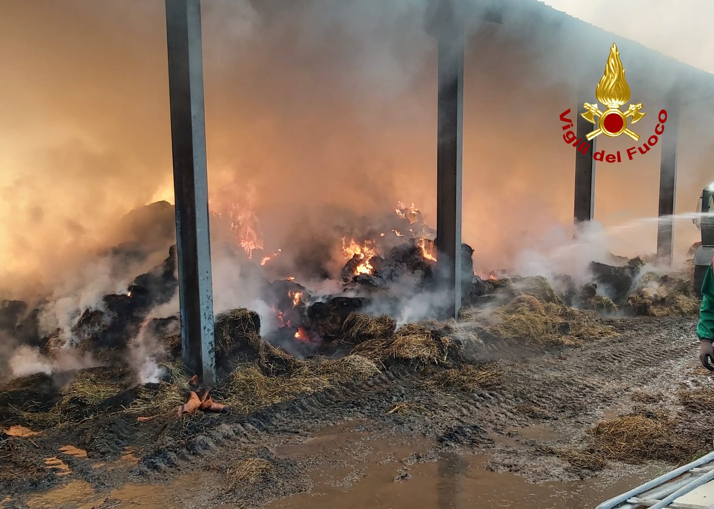 Incendio in un capannone contenete 130 rotoballe di foraggio, mangimi e macchinari: cause al vaglio dei vigili del fuoco
