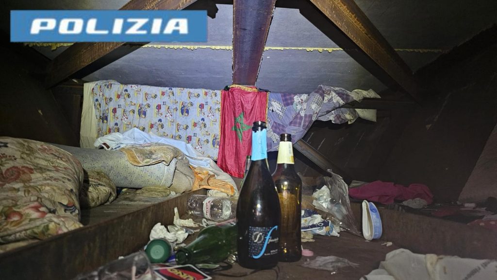 All’interno dello spazio, completamente al buio e con un’altezza di circa un metro e mezzo, i poliziotti hanno scoperto diversi giacigli di fortuna. Tra questi, anche i due cittadini stranieri segnalati, entrambi senza fissa dimora. La situazione igienico-sanitaria era gravemente compromessa: ovunque erano sparsi indumenti, avanzi di cibo, effetti personali, bottiglie vuote e altre contenenti urina, escrementi e spazzatura di vario tipo.