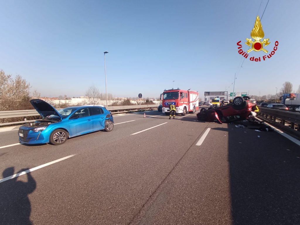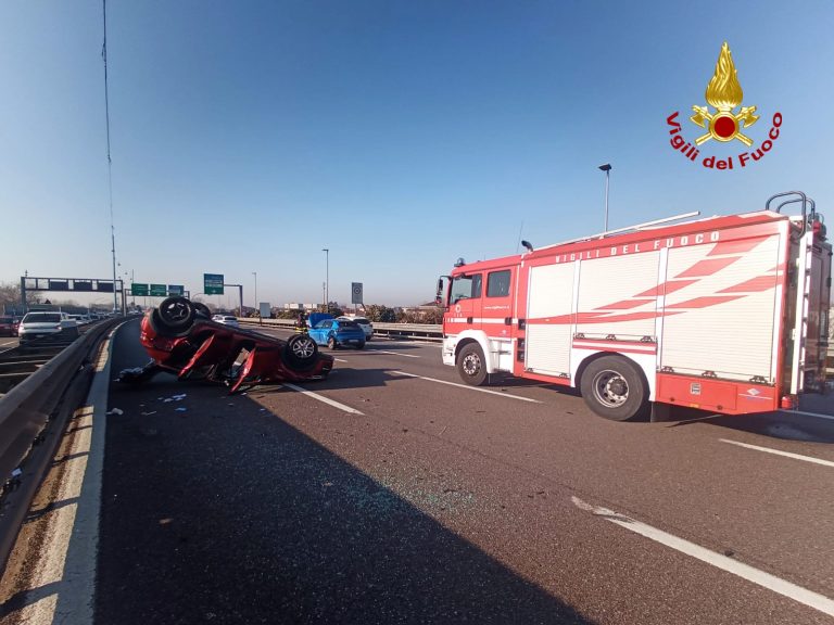Incidente lungo la tangenziale A57 in direzione Milano: una delle due auto è finita rovesciata