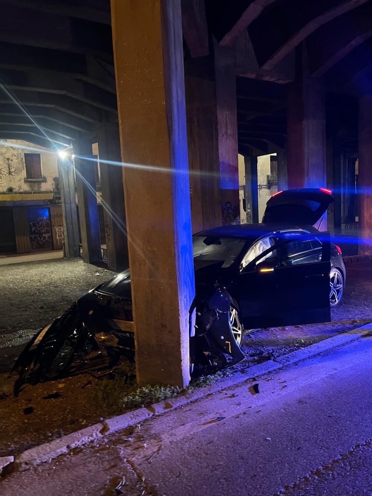 Il conducente, un italiano 20enne residente a Treviso, incurante del comando, ha tentato una fuga per sfuggire al controllo. Ne è conseguito un inseguimento ad alta velocità, per circa un kilometro, fino al piazzale Duca d’Aosta. Qui, il conducente ha perso il controllo dell’ auto andandosi a schiantare contro un palo del cavalcavia della S.S.13.
