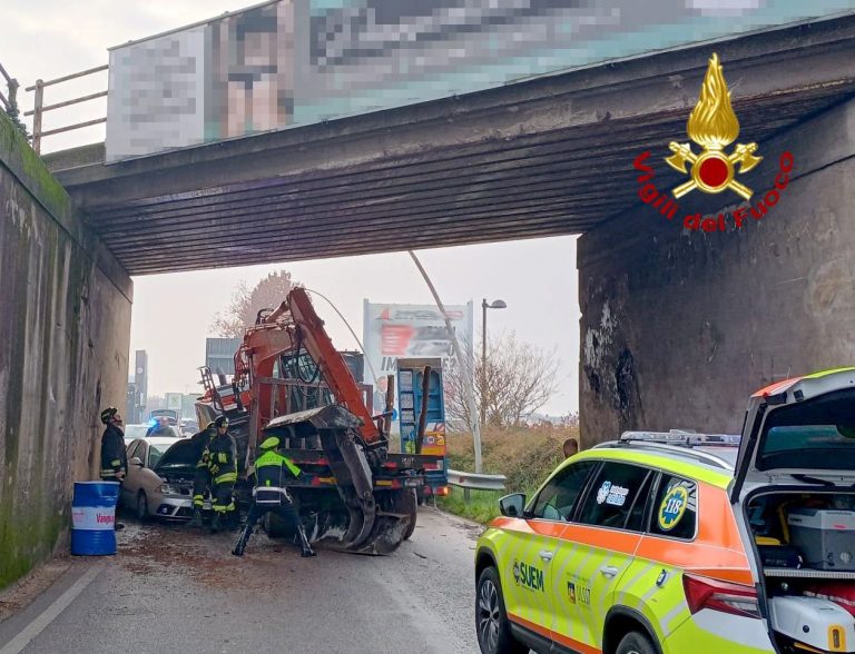 Il mezzo pesante coinvolto ha perso l’escavatore che trasportava nel cassone in corrispondenza di un sottopasso ferroviario. Il mezzo d’opera è finito sull’autovettura di una donna che gli passava accanto in quel momento. La signora rimasta incastrata nell’auto è stata estratta dai vigili del fuoco che la hanno consegnata alle cure del personale sanitario giunto sul posto. Sul posto presente la polizia locale per la gestione del traffico.