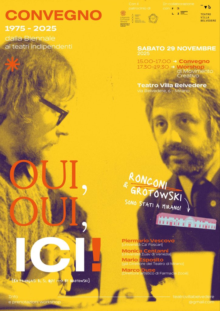 Mirano celebra 50 anni di storia del teatro con un convegno dedicato alla riscoperta dell’esperienza storica che pose le basi per il teatro contemporaneo nei territori: è “Oui, Oui, ICI! 1975 – 2025 dalla Biennale ai teatri indipendenti”, organizzato dal Comune di Mirano con il patrocinio dell’Università Ca’ Foscari e dell’Università IUAV di Venezia, in programma al Teatro Villa Belvedere di Mirano, con inizio alle ore 15.00, il prossimo sabato 29 novembre.