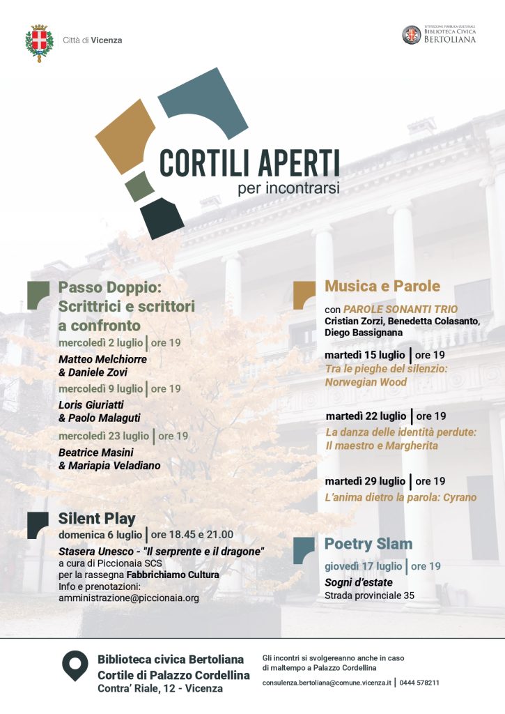 È ormai entrata nel vivo la rassegna culturale “Cortili aperti. Per incontrarsi” della biblioteca civica Bertoliana. Il giardino di palazzo Cordellina, settecentesco palazzo progettato in stile palladiano, dopo il successo dei primi tre incontri è ora pronto ad accogliere gli altri cinque eventi in programma fino al 29 luglio, tutti alle 19, a ingresso libero.