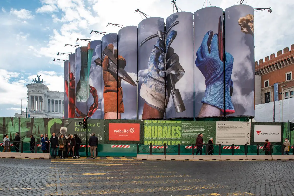 In ‘TOOLS’, l’artista si è concentrata sulle mani degli operai e degli archeologi del cantiere, fotografate mentre stringono gli strumenti del loro lavoro quotidiano (chiavi inglesi, scalpelli, cavi elettrici, catene, bulloni, spugne), per costruire ma anche per riportare alla luce reperti preziosi dal passato. L’opera stabilisce un legame simbolico e storico profondo con la città, ispirandosi ai simboli utilizzati per gli Angeli del Bernini su Ponte Sant’Angelo a Roma, che recano gli strumenti della Passione di Cristo. Come quegli angeli, sette lavoratori del cantiere tengono in mano i loro strumenti di lavoro, unendo sacro e laico, antico e contemporaneo in un’immagine doppia. Se gli strumenti del Bernini raccontano un momento drammatico, quelli rappresentati dall’operaevocano l’epicità del lavoro quotidiano – stringere, serrare, pulire, scalpellare, scavare – celebrando la forza simbolica della creazione e del saper fare. La nuova opera inedita, dedicata al tema del lavoro, nell’ambito del progetto ‘MURALES’ a cura di Spazio Taverna, prende il posto di ‘Ci eleviamo sollevando gli altrì di Marinella Senatore, a sua volta succeduta a ‘Costellazioni di Romà di Pietro Ruffo, continuando a trasformare i silos del cantiere della Stazione Venezia in una monumentale installazione a cielo aperto. Il progetto ‘MURALES’ si inserisce in un quadro di avanzamento dei lavori cruciali per la Capitale: nel cantiere di Stazione Venezia ha visto completare la prima macrofase dei lavori, con scavi fino a 85 metri di profondità che porteranno alla luce l’antica Via Flaminia, per passare poi alla nuova macrofase. In parallelo, il consorzio costruttore ha consegnato due archeo-stazioni cruciali, Colosseo/Fori Imperiali e Porta Metronia, la cui apertura al pubblico è prevista il 16 dicembre. Queste stazioni sono un modello internazionale di successo frutto di una stretta collaborazione tra istituzioni e imprese, che ha permesso tra l’altro di valorizzare il ritrovamento di una caserma romana a Porta Metronia. L’impegno del consorzio prosegue anche per la progettazione esecutiva della Tratta T2 (Venezia-Clodio/Mazzini) che include due nuove archeo-stazioni, San Pietro e Chiesa Nuova.