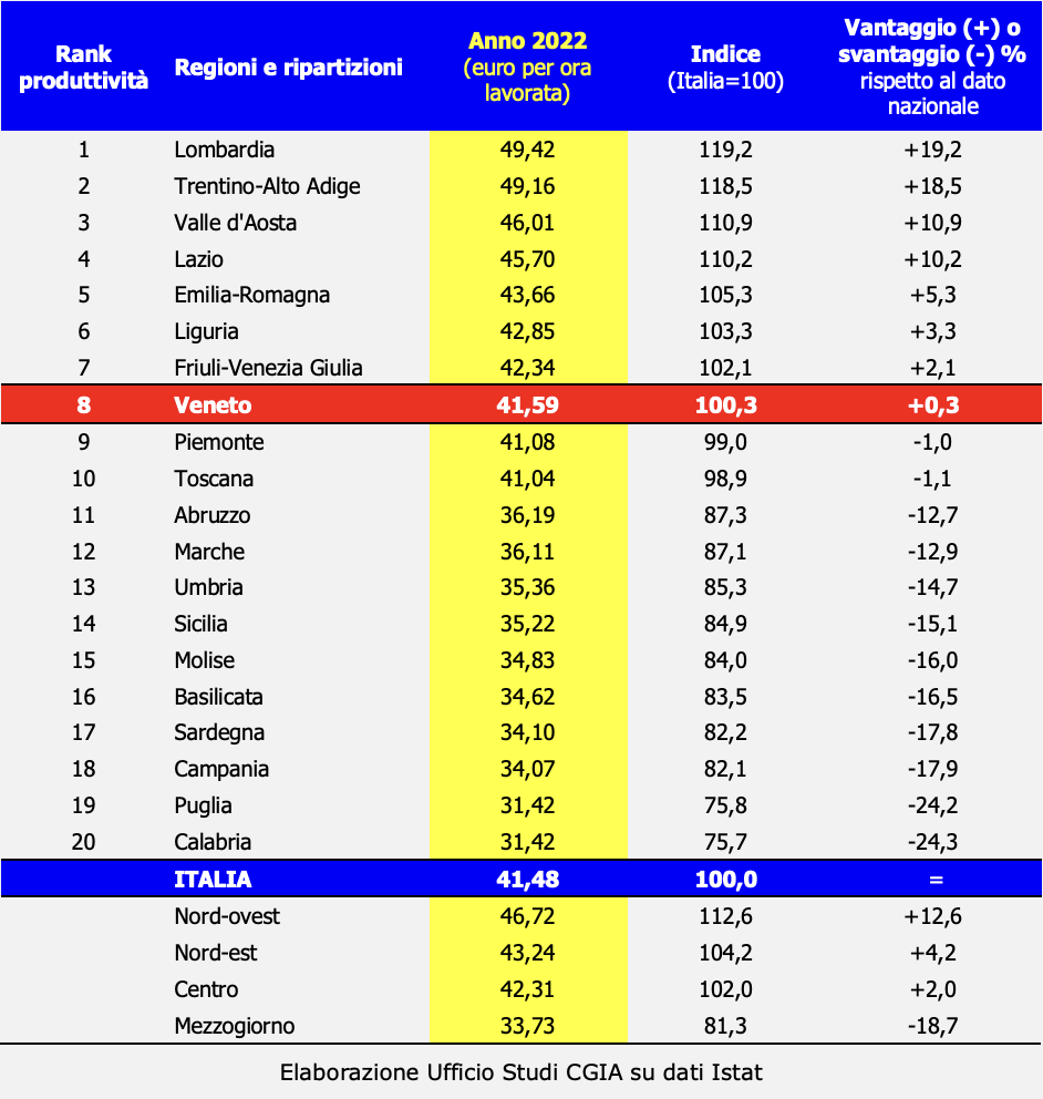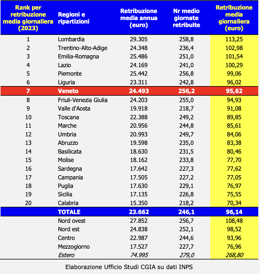 Secondo l’analisi, nelle aree geografiche del Paese dove le ore lavorate sono più elevate, anche la produttività è maggiore e conseguentemente gli stipendi e i salari sono più pesanti. Se, come riporta la Cgia, in Veneto la retribuzione media giornaliera nel 2023 era di 95,6 euro lordi, al sud si è fermata a 77 euro, pari a un differenziale del 24%.