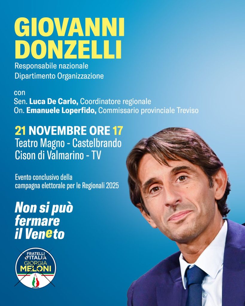“I cittadini della Marca trevigiana hanno dimostrato una partecipazione straordinaria durante tutta la campagna elettorale – ha dichiarato Loperfido – . Con questo evento vogliamo però comunque ribadire ancora una volta il nostro impegno futuro per un Veneto che continui a crescere, a innovare e a difendere le proprie comunità. In tutto questo la presenza di Giovanni Donzelli testimonia l’attenzione nazionale verso il nostro territorio e verso una squadra che ha lavorato senza sosta“.
