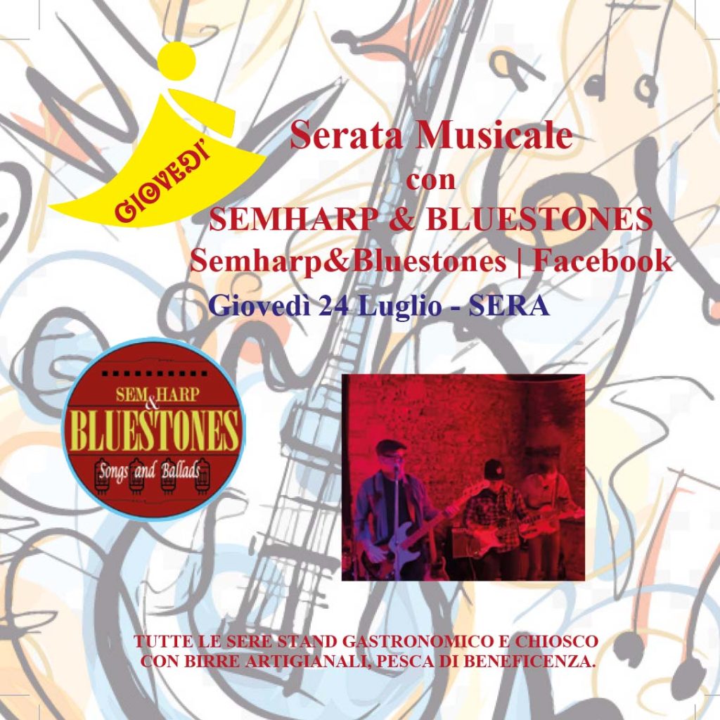 – Giovedì 24 si inizia con l’apertura ufficiale di stand gastronomico e chiosco con l’accompagnamento musicale della blues band Semharp & Bluestones.