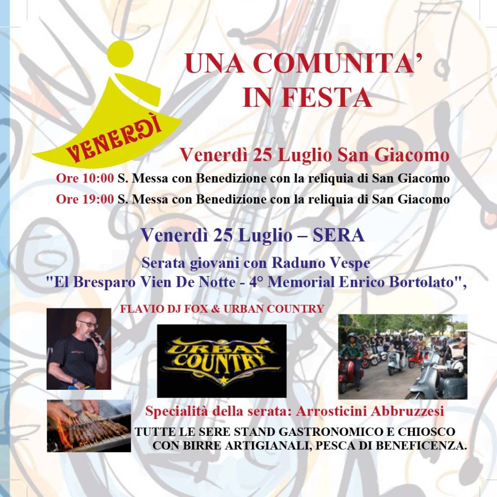 – Venerdì 25 si celebra la festa liturgica di San Giacomo con le Sante Messe delle ore 10.00 e 19.00. In serata ci sarà il raduno: “El Bresparo vien de notte – 4°memorial Enrico Bortolato” seguito dalla serata musicale con Flavio Dj Fox & Urban Country.