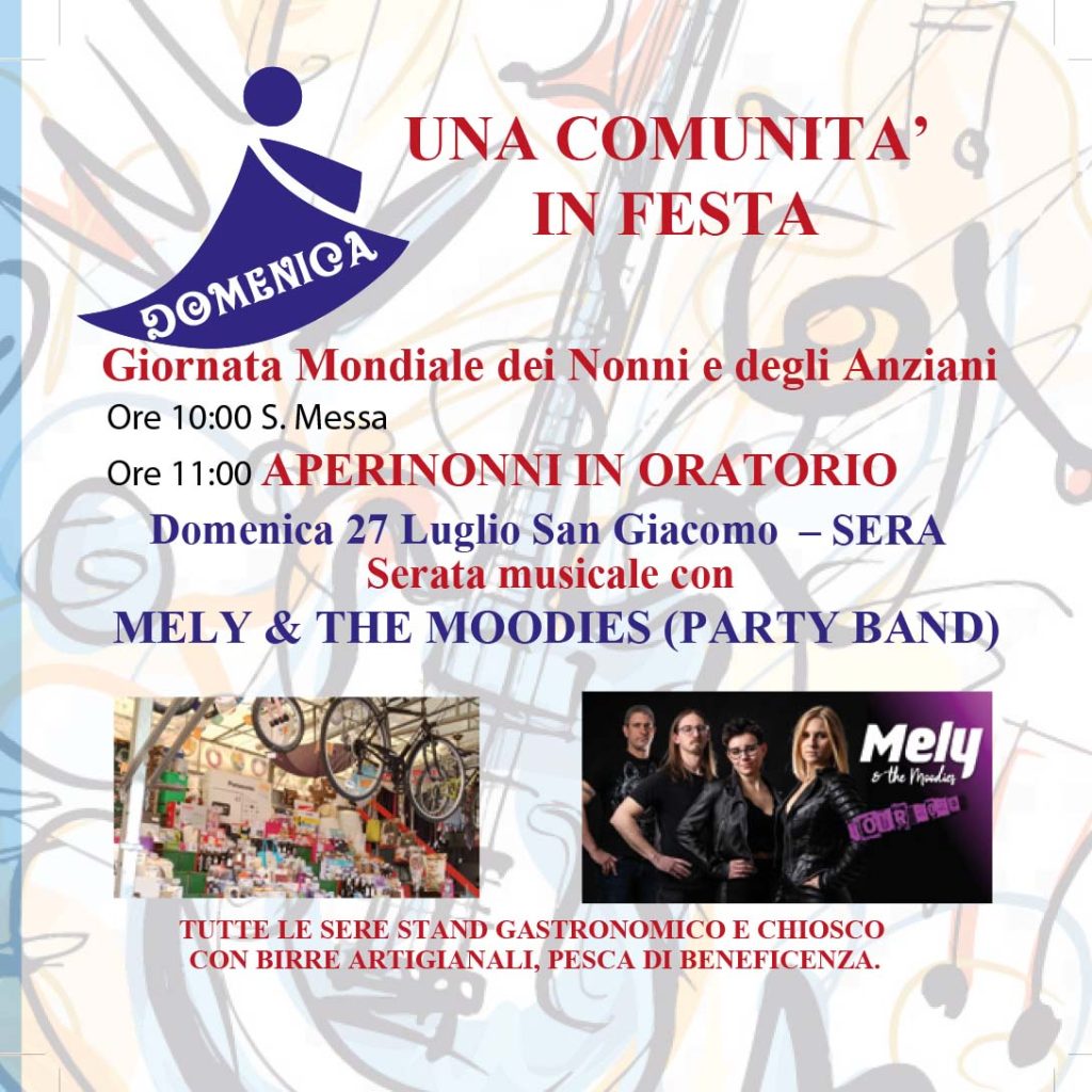 – Domenica 27 al mattino, alle ore 10.00, la Santa Messa per la Giornata Mondiale dei Nonni e degli Anziani, con a seguire un momento di festa “Aperinonni” in oratorio; in serata si esibiranno Mely & The Moodies, con un repertorio pop-rock energico.