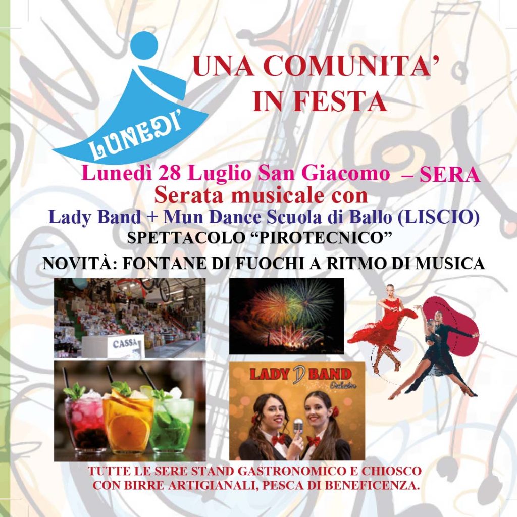 – Lunedì 28, il gran finale con la Lady Band e la scuola di ballo Mun Dance. Per concludere spettacolare show con “Fontane di fuochi a ritmo di musica”, una novità dell’edizione 2025.