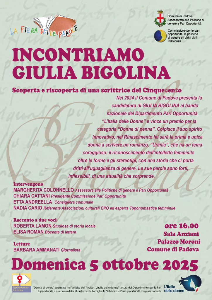 L’opera di Giulia Bigolina affronta con coraggio il tema del riconoscimento dell’intelletto femminile, oltre forme e stereotipi, e conduce con forza verso il principio di uguaglianza di genere. La sua biografia, presentata dal Comune di Padova, è risultata vincitrice dell’avviso pubblico “L’Italia delle donne”, promosso dal Dipartimento per le Pari Opportunità, nella categoria “Donne di penna”, per l’individuazione di figure femminili che hanno istituito un legame significativo con il territorio e che meritano di essere sottratte all’oblio e di far parte della memoria nazionale. La cerimonia di premiazione si è svolta lo scorso 7 marzo a Roma al Maxxi.