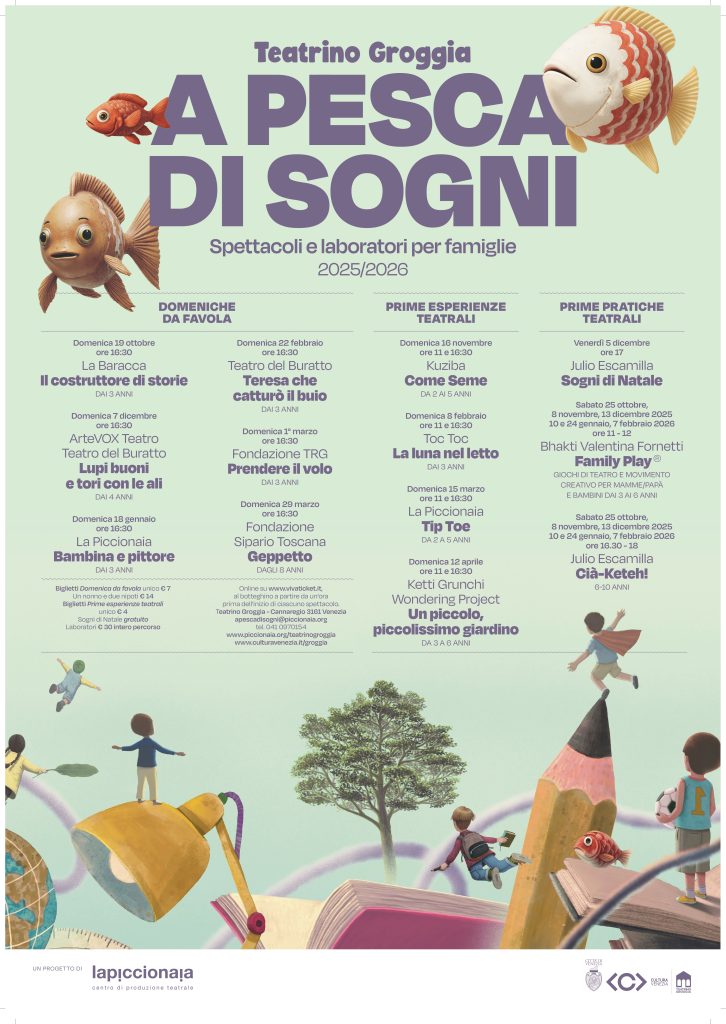 Al Teatrino Groggia è in partenza la quinta stagione dedicata più piccoli “A Pesca di Sogni 25-26”. Dal 19 ottobre al 12 aprile, 10 spettacoli e 14 repliche di teatro per le famiglie, 3 laboratori per diverse fasce d’età e 5 appuntamenti per le scuole.