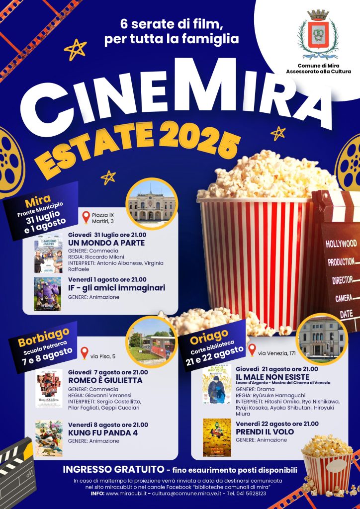 Torna l’immancabile appuntamento con il cinema estivo all’aperto. L’assessorato alla Cultura di Mira propone alla cittadinanza l’iniziativa CineMira Estate 2025 : sei appuntamenti al giovedì e venerdì, in tre location diverse nel territorio comunale.