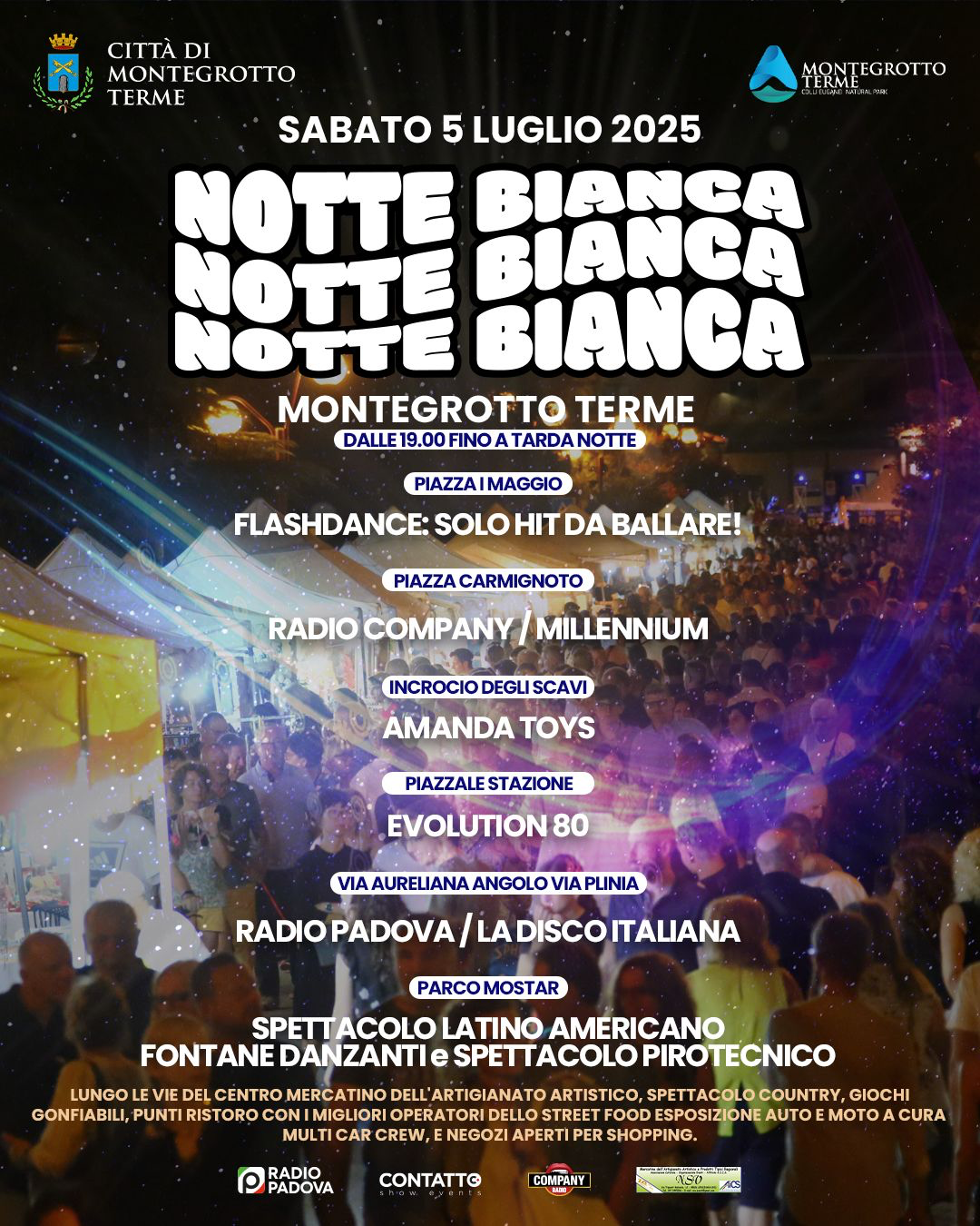Sabato 5 luglio 2025 il centro storico di Montegrotto Terme si trasformerà in un palcoscenico a cielo aperto per la “Notte Bianca”.