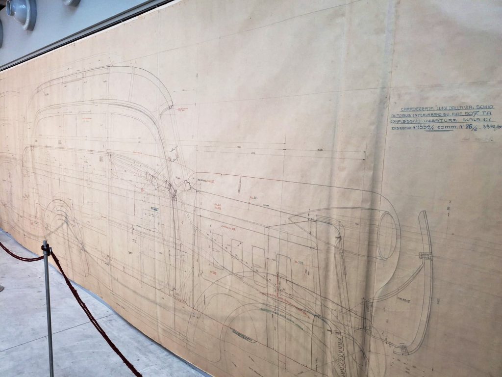 In esposizione circa 200 tra disegni, fotografie e documenti storici, oltre a filmati, modellini costruttivi e modelli di pullman d’epoca. Il percorso è arricchito da un pezzo di eccezionale impatto: un disegno storico in scala 1:1, lungo circa 8 metri, dell’autobus interurbano FIAT 507 F.A. del 1942, che racconta la precisione progettuale e l’ambizione industriale dell’azienda scledense.