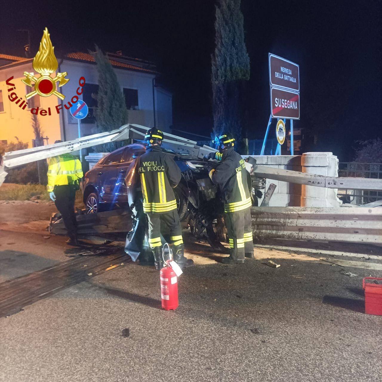 Ieri sera intorno alle 22.30 i vigili del fuoco di Conegliano sono intervenuti per la fuoriuscita del veicolo finito contro il guardrail a Ponte della Priula
