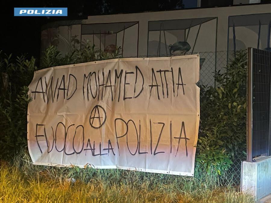 A scoprirlo sono state le pattuglie della Questura di Padova, verso le 4.30 di questa mattina, mentre perlustravano Passeggiata Miolati, alle spalle dei Giardini dell’Arena: uno striscione bianco, di grandi dimensioni, affisso su una recinzione. In grandi caratteri neri, la scritta: “Awad Mohamed Attia – Fuoco alla Polizia”. Al centro, la “a” cerchiata, riconducibile ai movimenti anarchici.