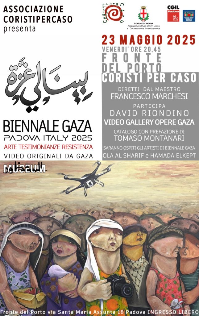 A Padova una serata per non voltarsi dall’altra parte e dare valore ai fatti del mondo anche attraverso l’arte: è questo il cuore dell’evento organizzato dall’associazione Coristi per Caso e in programma per questa sera, venerdì 23 maggio dalle ore 20.30, al Fronte del Porto. Sarà infatti una serata evento a ingresso libero, dedicata a Biennale Gaza, l’iniziativa creata da 50 artisti palestinesi, la maggior parte di loro ancora a Gaza tra le macerie, alcuni adesso in Europa dopo essere riusciti non senza difficoltà ad uscire da quella che è a tutti gli effetti una prigione a cielo aperto.