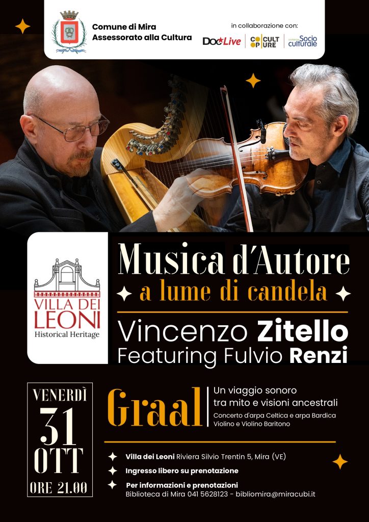 L’amministrazione comunale di Mira presenta una serata di musica d’autore a lume di candela per riscoprire il fascino del mito e delle sonorità antiche. Protagonisti della serata saranno Vincenzo Zitello, pioniere dell’arpa celtica in Italia e riconosciuto a livello internazionale come uno dei massimi interpreti dello strumento, e Fulvio Renzi, violinista e compositore dalla formazione classica.