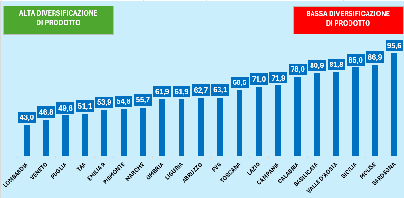 La regione che a livello nazionale presenta l’indice di diversificazione peggiore è la Sardegna con il 95,6%, dove domina l’export dei prodotti derivanti dalla raffinazione del petrolio.