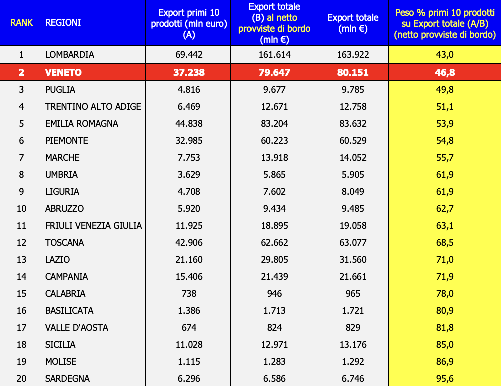 L’analisi proposta dalla Cgia si fonda sulla misurazione dell’indice di diversificazione di prodotto dell’export per regione. Tale parametro, pesa il valore economico delle esportazioni dei primi 10 gruppi merceologici sul totale delle vendite estere.