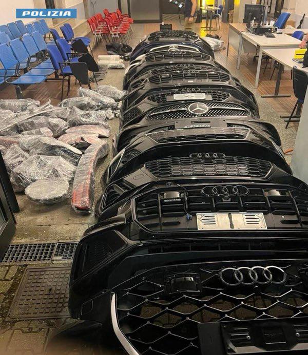 La refurtiva rinvenuta comprende un paraurti anteriore Mercedes grigio scuro, rubato a Mestrino (PD) il 9 maggio; un paraurti anteriore Audi RSQ8 blu/nero, con targa, rubato a Oriago (VE) il 12 maggio; un volante Audi modello S con palette e altri componenti di un’Audi Q8, rubati a Padova tra il 6 e il 7 maggio; un paraurti completo con componenti elettroniche di un’Audi Q8 nero, sottratto a Selvazzano Dentro (PD) tra l’8 e il 9 maggio.