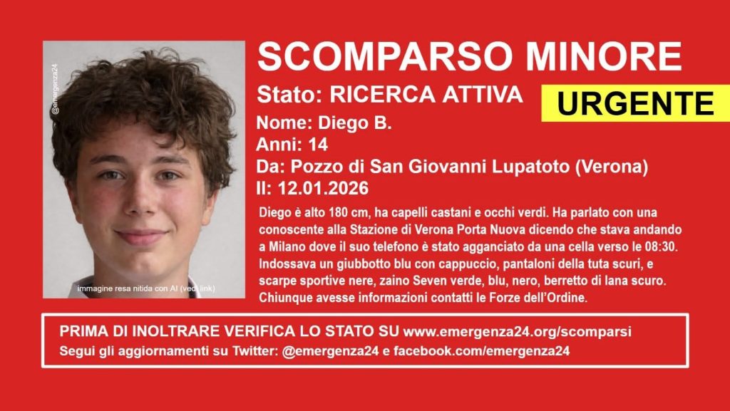 Ricerche in corso per Diego, 14 anni, scomparso da Verona il 12 gennaio 2026. L’ultimo segnale del cellulare nei pressi di Milano